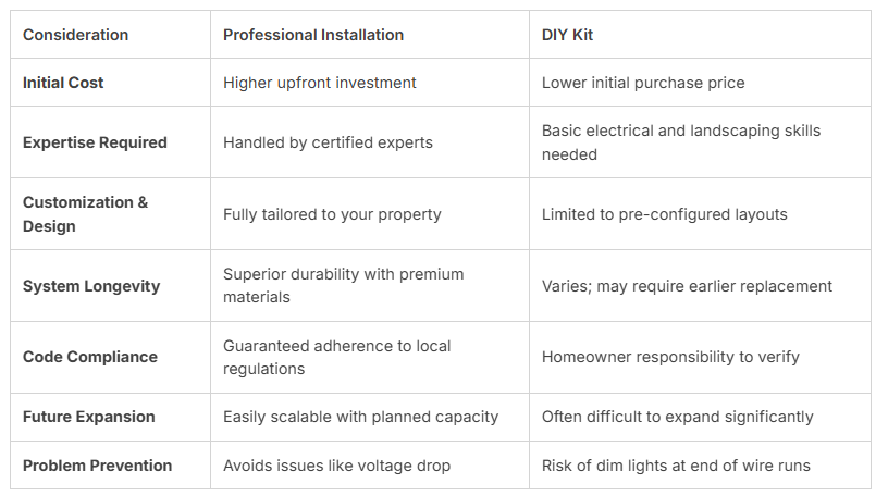 While DIY kits are available, professional installation is highly recommended for a lasting, high-quality result. A certified installer will ensure proper transformer sizing, secure and discreet wire burial, optimal fixture placement for effect, and compliance with any local codes, ultimately protecting your investment and property.