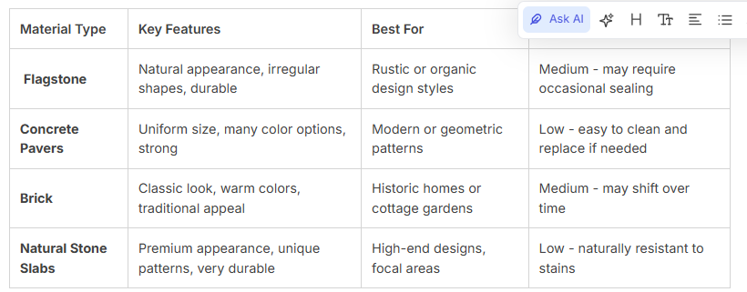 Your choice of materials impacts durability, aesthetics, and maintenance. Flagstone offers a natural, irregular look with excellent durability. Concrete pavers provide uniform strength and come in many colors and shapes.