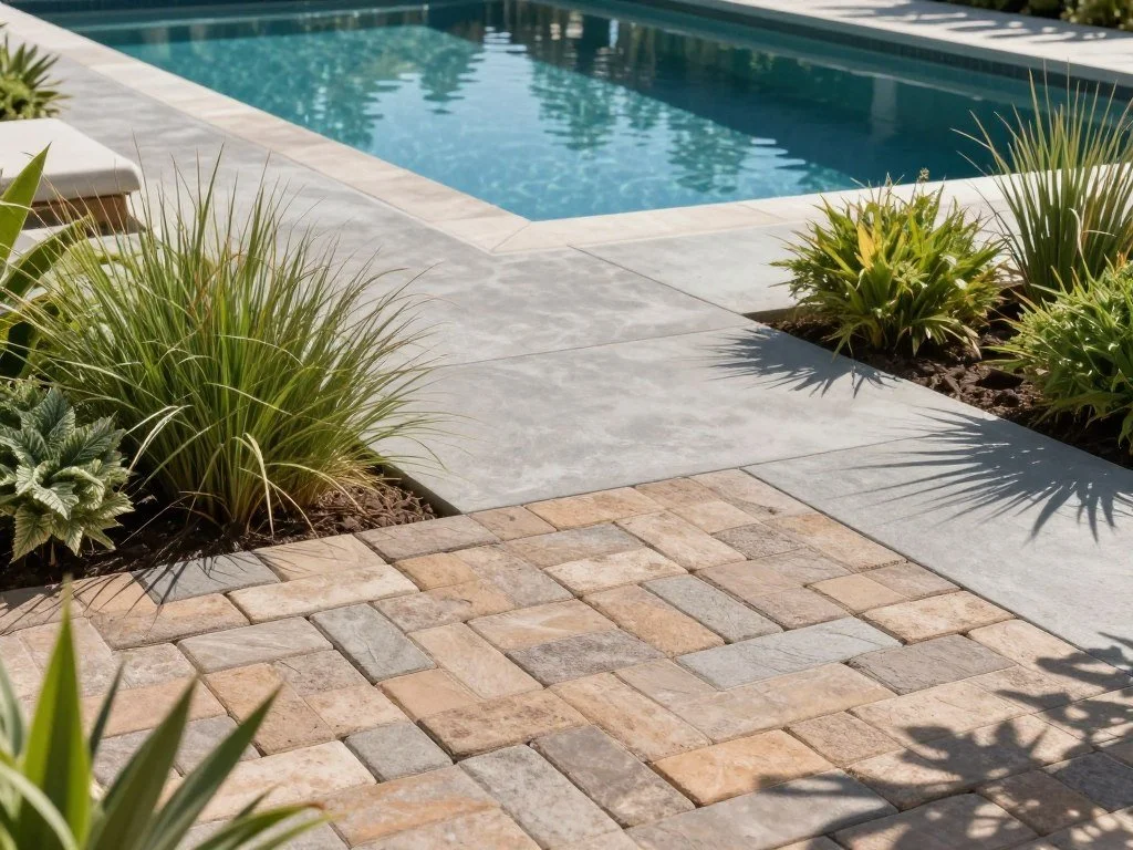 Concrete pavers and textured tiles are top picks for safety. Their surfaces provide grip, even when wet from swimming.