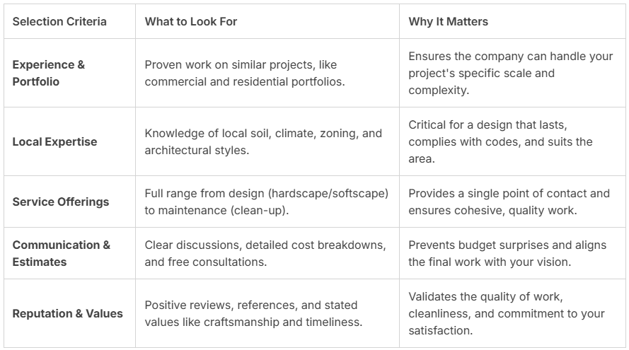 Review a company's service list thoroughly. Ensure they can handle all aspects of your project from start to finish. This includes initial design, hardscape installation, and ongoing care.