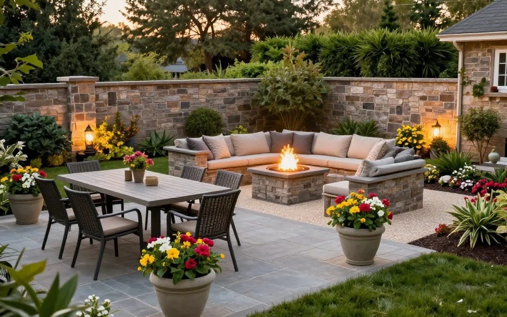 Integrating multiple elements—like a patio with an adjacent fire pit and a retaining wall —creates a cohesive outdoor room.