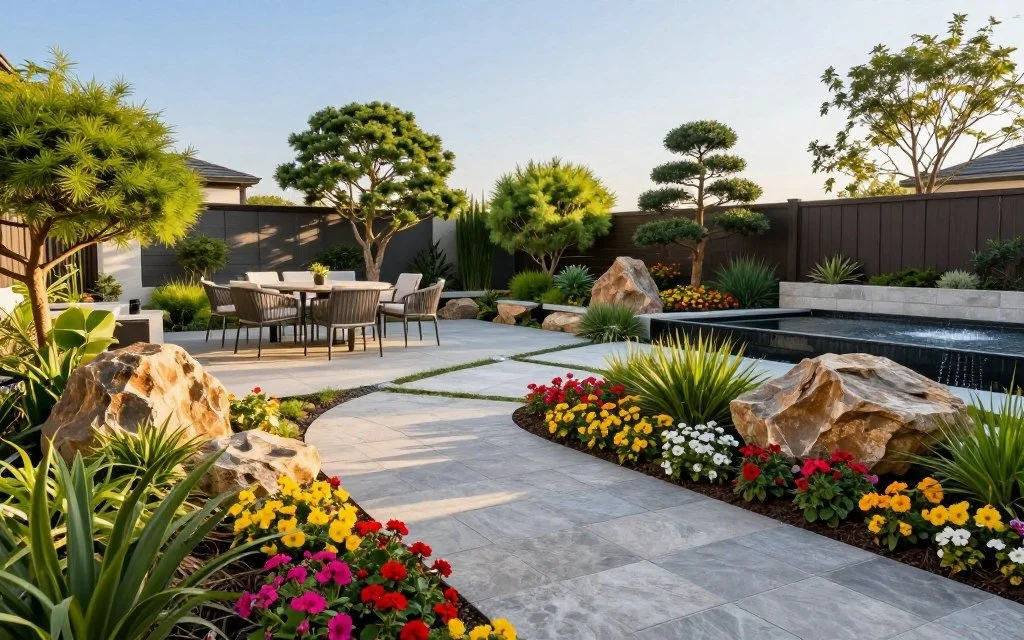 These elements introduce vibrant color, soft texture, and seasonal change. They soften the look of stone and concrete surfaces.