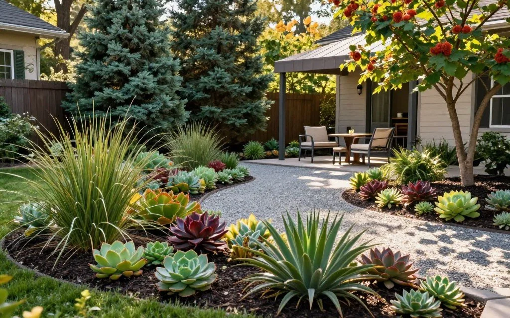 Examples like Delis Landscaping garden demonstrate successful low-maintenance transformations.