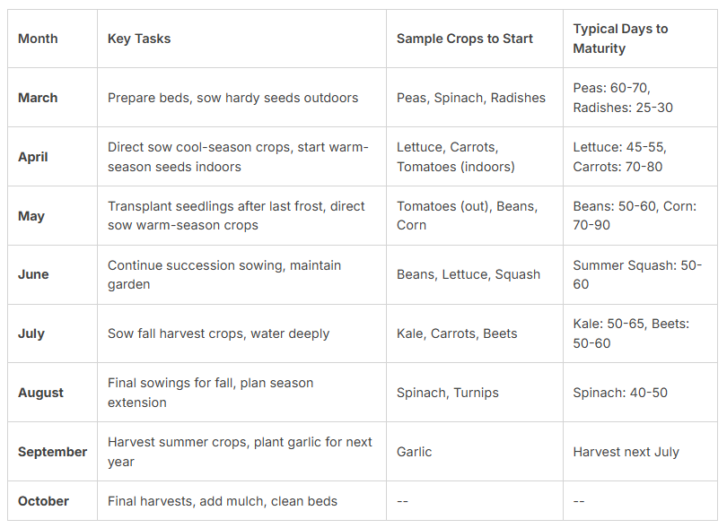 It depends on the crop and the season. Tender plants like tomatoes, peppers, and eggplants need a long, warm season. Start these indoors 6-8 weeks before the last spring frost. Hardy crops like peas, carrots, and radishes prefer cool soil and can be sown directly in early spring. For a fall harvest, many greens and roots are also directly sown in late summer.
