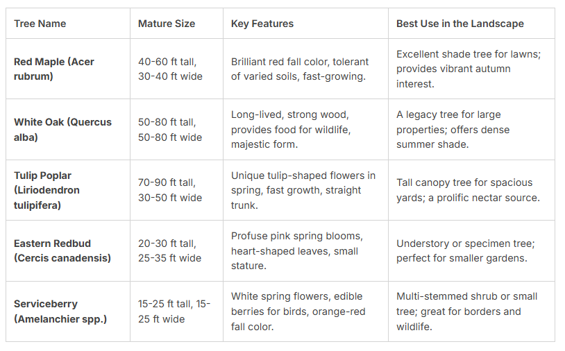 Native trees are exceptionally well-adapted to local soils and climate. They typically require less water and fertilizer once established. They also support local birds, pollinators, and other wildlife.