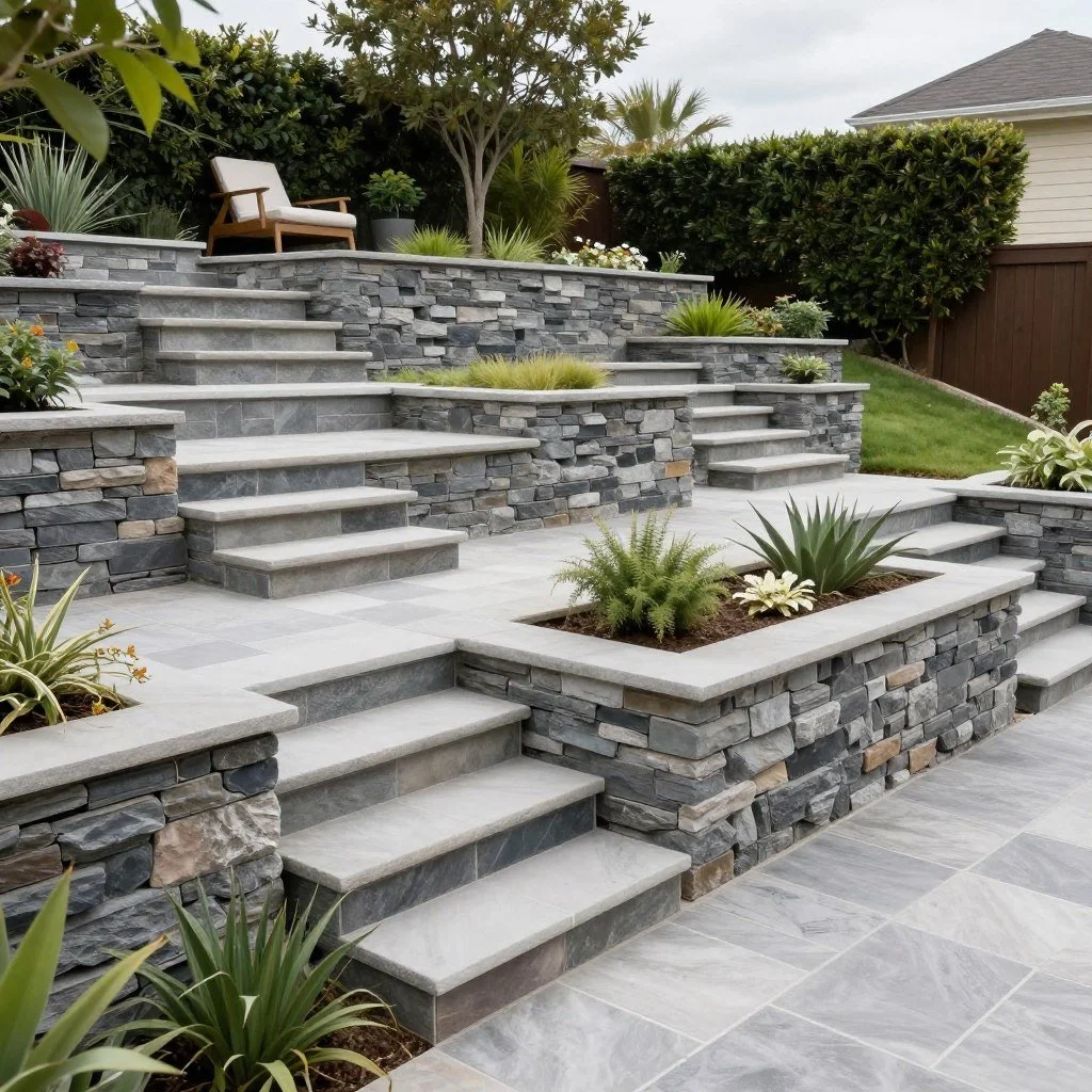 Turn challenging slopes into assets with multi-level designs. Retaining walls create distinct outdoor zones, each with unique purposes and plantings that enhance beauty.